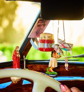 The tradition goes back to family rituals and devotional items passed down from abuelas and padres. When young Chicanos got their first cars in the 1960s and ’70s, they brought those tokens of faith along — rosaries, scapulars, St. Christopher medallions — and placed them where they’d be seen. Over time, the dashboard and the mirror became the perfect place for these items: visible, personal, and always in motion.